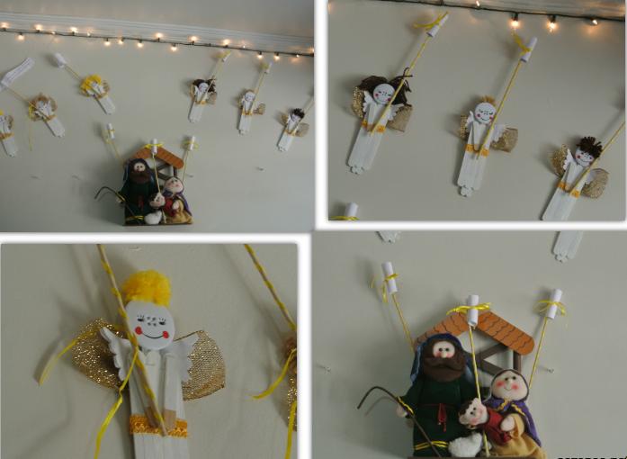 Antes de fazer a novena, preparamos numa atividade de artesanato, junto com as crianças esses anjinhos com palitos de sorvete e, junto com esse presépio que já tínhamos, planejamos os temas da novena desse ano. Ainda por cima virou uma decoração de Natal na parede da sala, que é onde fazemos nossas orações (mais solenes) em família!